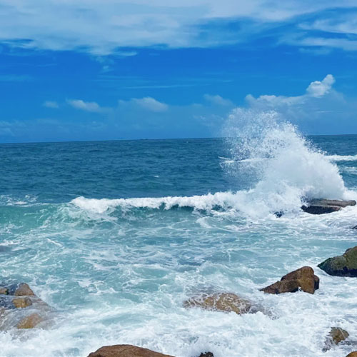 此刻,我就站在海边,远眺着比大海更远的海,这红海湾的海水蓝得像天空一样,每一片波浪都是云的形状,一阵渔歌又从风口浪尖飘来了:“头帆推起尾翘翘,中帆推起船转头……”